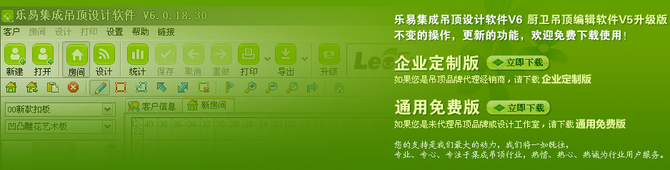 樂易集成吊頂設計軟件V6可以在本站上免費下載安裝,我們非常希望您能把使用過程中的問題、意見、建議及時反饋給我們,以便我們不斷完善和升級軟件。